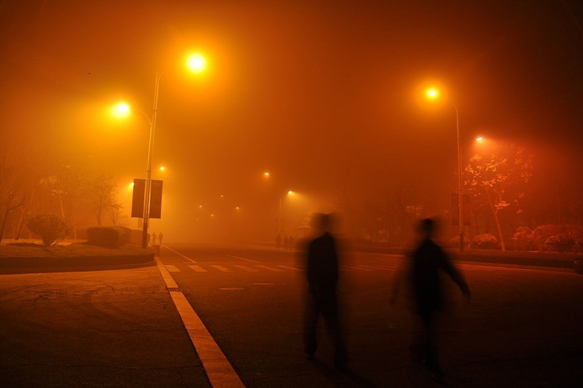 - 12月7日18时,中央气象台发布雾霾橙色双预警,预计7日夜间到8日上午,河北中东部、北京东部、天津、江苏、上海、安徽中东部、浙江北部、江西东北部、四川盆地等地有大雾,部分地区有能见度不足500米的浓雾,局地有不足200米的强浓雾。7日20时到8日20时,江苏、浙江中北部、安徽中东部、山东西部和南部、河南东部、河北中南部、北京中南部、天津等地空气污染气象条件达4~5级,局地可达6级,不利于空气中污染物扩散,上述大部地区有中度霾,其中,江苏中西部、浙江北部、安徽东部、河北中南部、北京南部、天津等地的部分地区有重度霾。图为12月7日晚上,山东省日照市,市民在雾霾中行走。 刘明照/CFP
