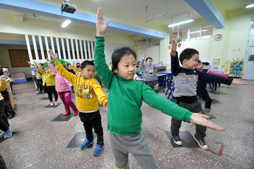 12月17日,河北省邯郸市第一幼儿园的孩子们在教室内做自创的武术健身操。当日,河北省发布霾黄色预警,据环境部门监测,该省唐山、保定、廊坊、石家庄、衡水、邢台和邯郸为重度到严重污染。 郝群英/东方IC