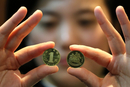 - 12月23日,2014年马年贺岁普通纪念币在全国发行。该普通纪念币面额1元,发行数量1亿枚,与现行流通人民币职能相同,与同面额人民币等值流通。图为浙江省余姚市,一名银行工作人员在展示即将发行的马年普通贺岁纪念币。 东方IC