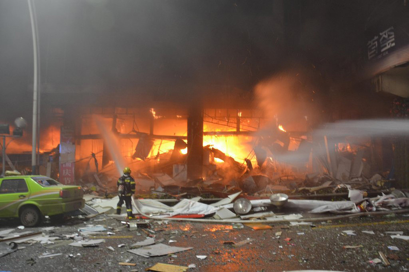 12月26晚,四川泸州江阳区摩尔商场发生爆炸,事故现场,消防人员正在灭火。 万家岭/CFP