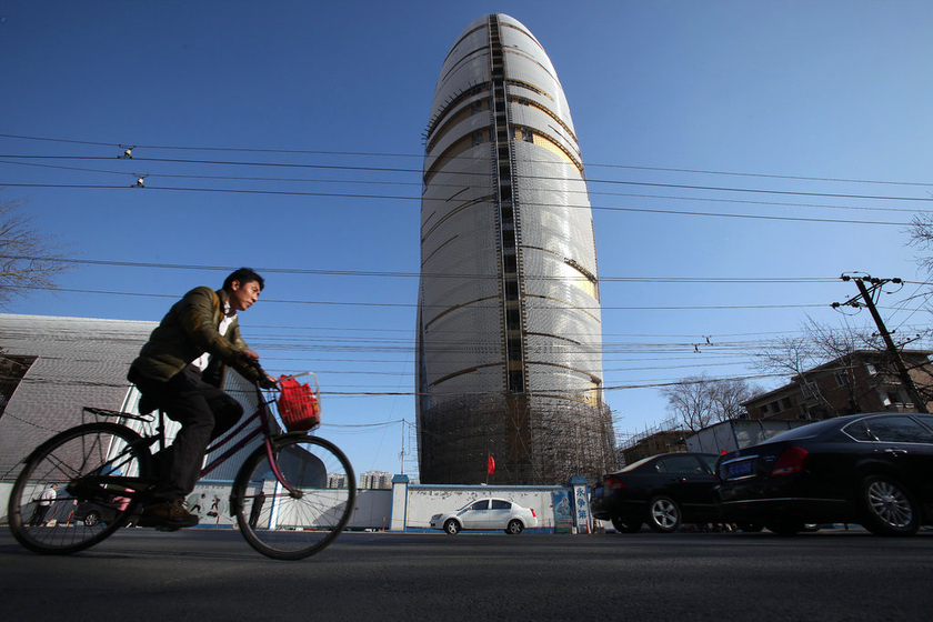 - 1月5日,北京,工人为人民日报新大楼的外层安装白色的琉璃棍,银白色外层基本覆盖了整个楼体,曾经被网友热议的土豪金外表已成“内衣”。 卓恩森/CFP