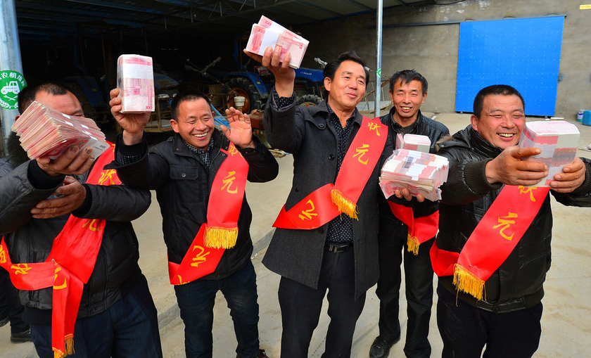 1月10日,江西省安义县,领到钱后开心不已的农民。 杨继红/CFP