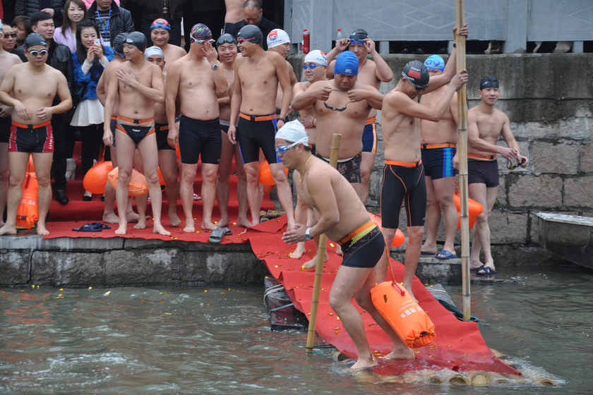 2月17日,浙江温州瑞安市仙降街道的50多名胶鞋厂老板陆续跳入当地的东河游泳,引发岸边近千人围观。据悉,此前有20多年没人敢下东河游泳了。去年当地投入2000万元治水,水质有一定改善。 林文/CFP