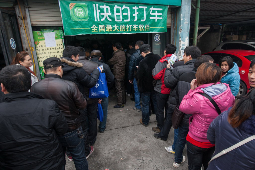 2月19日,随着“嘀嘀”、“快的”两家打车软件的“烧钱”竞赛愈演愈烈,众多出租车司机来到两家打车软件公司的杭州服务点,排队安装司机版软件。司机们表示,安装打车软件,一是为了紧跟潮流方便做生意,二是可以得到更多的“奖励”补贴。 陈中秋/CFP