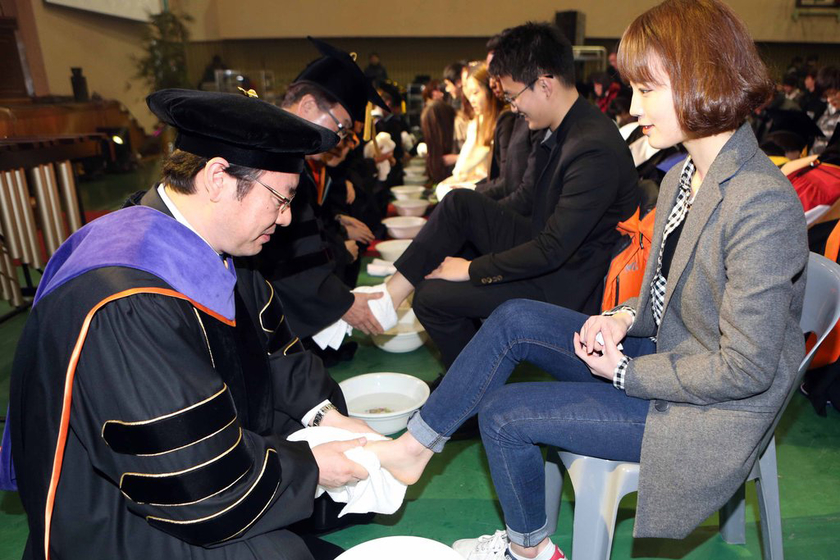 韩国大学校长教授为学生集体洗脚