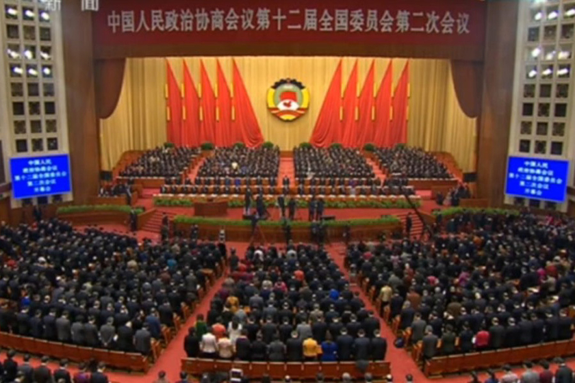 3月3日下午,中国人民政治协商会议第十二届全国委员会第二次会议开幕。全体与会人员为在3月1日晚云南昆明火车站发生的严重暴力恐怖事件中遇难的群众默哀。(央视截图)