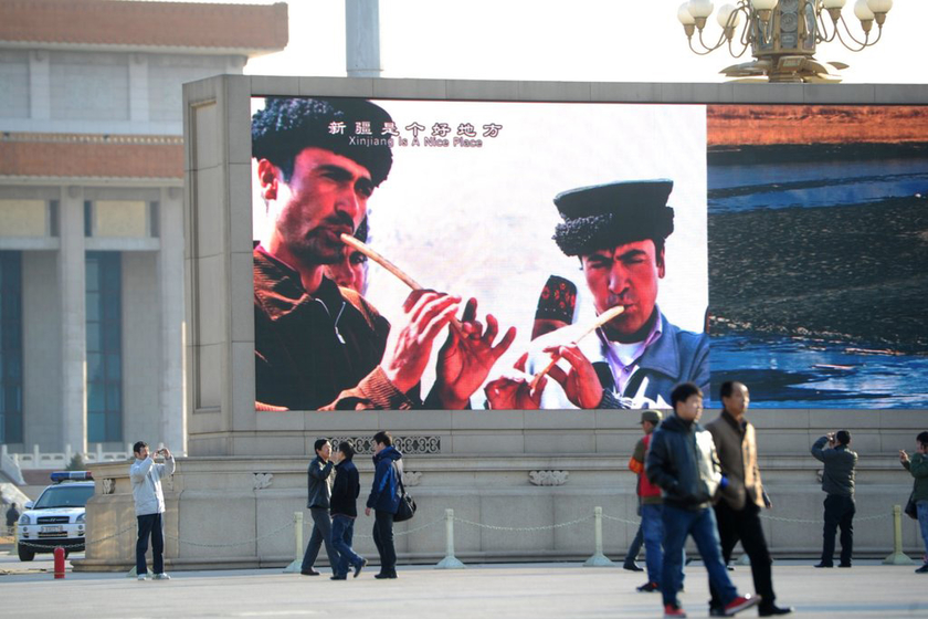 3月5日,全国人大第十二届二次会议在北京人民大会堂开幕。会议期间,天安门广场的大屏幕上播放新疆宣传片。 小可/CFP