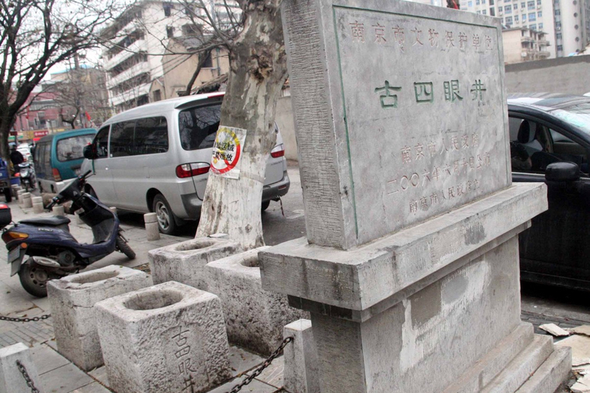 - 3月25日,在南京建邺区汉中门南侧的汉中门广场上有一处文物古迹——明朝“四眼古井”,四眼古井前竖着南京市人民政府竖立得“南京市文物保护单位”的石碑。 方龙/东方IC