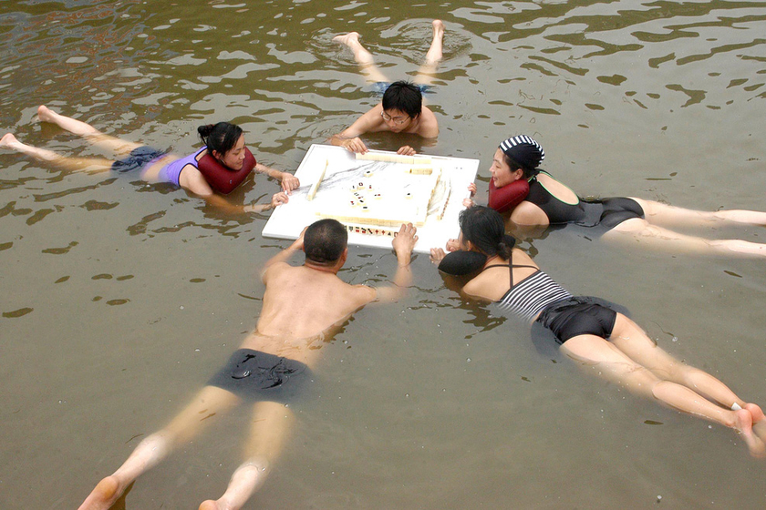 2008年7月26日,江苏连云港市连岛海滨游乐场,外地游客在“人造死海”里玩麻将。 王春/东方IC
