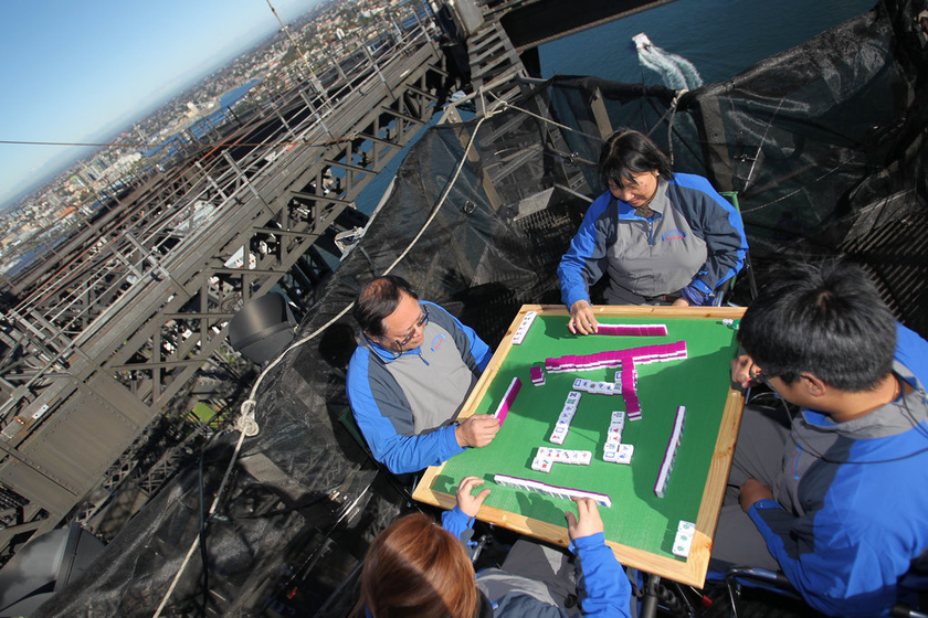 当地时间2013年5月17日,澳大利亚悉尼,一场麻将擂台赛在距海平面134米高的悉尼海港大桥顶端拉开战幕,4名澳洲华人在悉尼大桥顶端展开激烈竞逐。 CFP