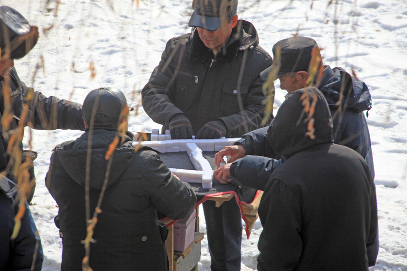 2012年2月17日,吉林省吉林市松花江畔,几名老人不惧零下23度的寒冷天气,在冰天雪地的露天场所里打麻将。 丁冬/东方IC