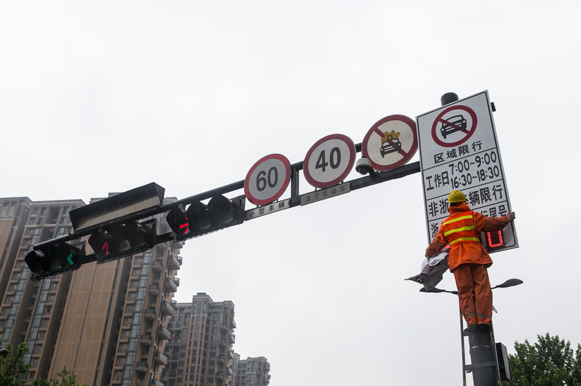 2014年5月5日起,杭州实施近3年的“错峰限行”措施正式升级。新版限行措施将显示时间在早晚高峰各延长和提前半小时。同时,在限行时间内,非浙A号牌的车辆在错峰限行区域以及绕城高速合围区域内的城市高架道路(含匝道以及附属桥梁、隧道)上禁止通行。工人撤换交通信号灯旁的限行指示牌。