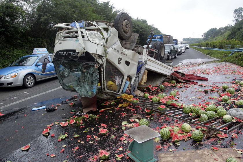 5月5日,海南东线高速公路定安县路段,距离海口约50公里处,一辆从三亚开往海口方向的运输西瓜货车因雨天路滑、下坡速度快撞在左侧护栏上翻车,车上2吨多西瓜洒满路面,无人员伤亡。 萧风/CFP