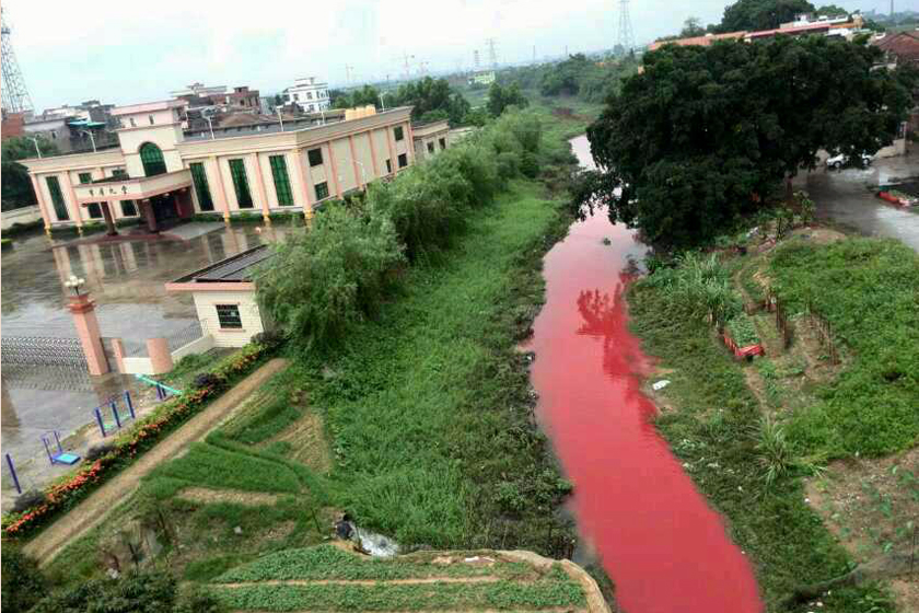 - 5月12日下午,广东惠州市博罗县通报,该县园洲镇有企业趁暴雨偷排污水。举报网友称博罗县园洲镇李屋村北冲口排渠突现红色、蓝色河水,并直指河涌污染源自旁边的高头村一工业区。有关部门立即赴现场查处。图为13日的水渠水分显红、蓝色。 CFP