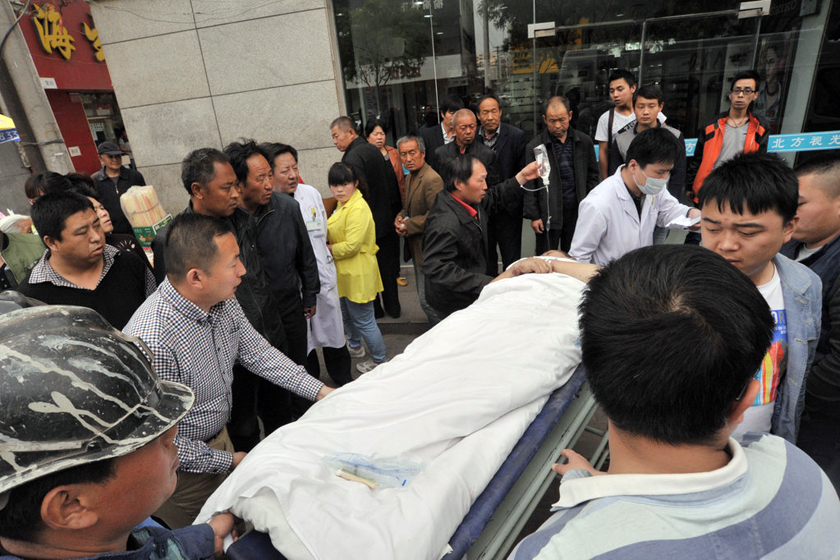 - 5月14日上午11时左右,陕西榆林市榆阳区境内中煤大海则在建煤矿一号副立井发生事故。当班井下作业人员37人,经紧急施救,有26人升井,11人被困井下。受伤人员已送往医院救治,截止发稿时,2人已经抢救无效死亡。图为事发当天上午11时,有获救工人被送往医院急救。 牛牛/CFP