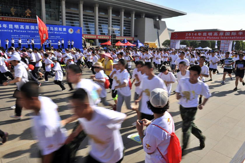 - 5月26日,昆明,昨天上午9点,参赛人数规模达1万人的2014昆明高原国际半程马拉松赛在呈贡区鸣枪开跑,近万名长跑爱好者积极参与。10多名参与者在跑步途中晕倒,其中有1人因抢救无效死亡。图为5月25日,昆明高原国际半程马拉松正式鸣枪开炮现场。 CFP