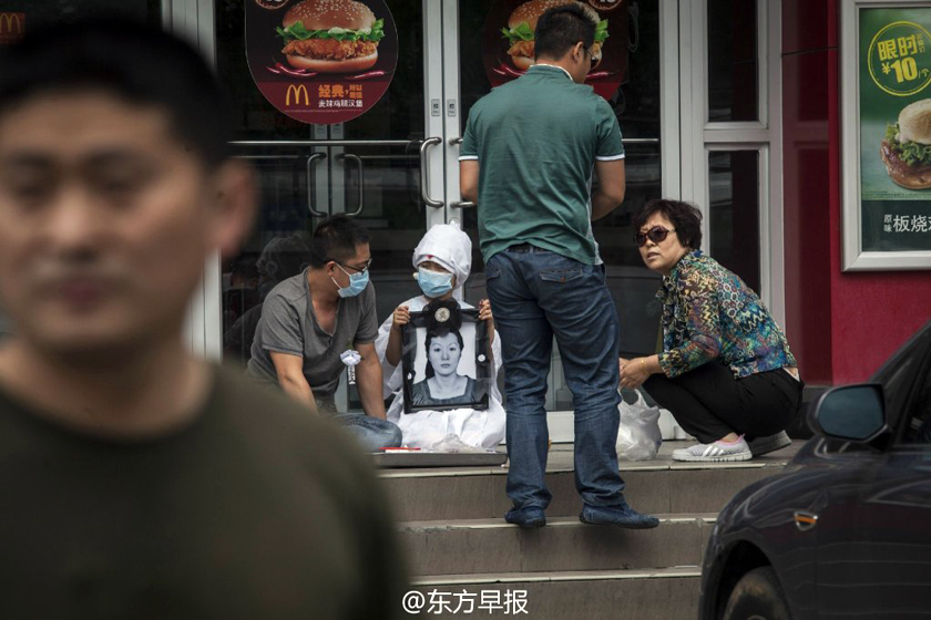 - 2014年6月3日,今天是“招远血案”死者头七。上午10点10分,死者的丈夫、儿子等多名亲属来到事发麦当劳门前祭奠,整个过程持续了五分钟。 图片来源@东方早报