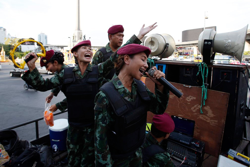 泰国女兵街头唱歌 防民众集会示威