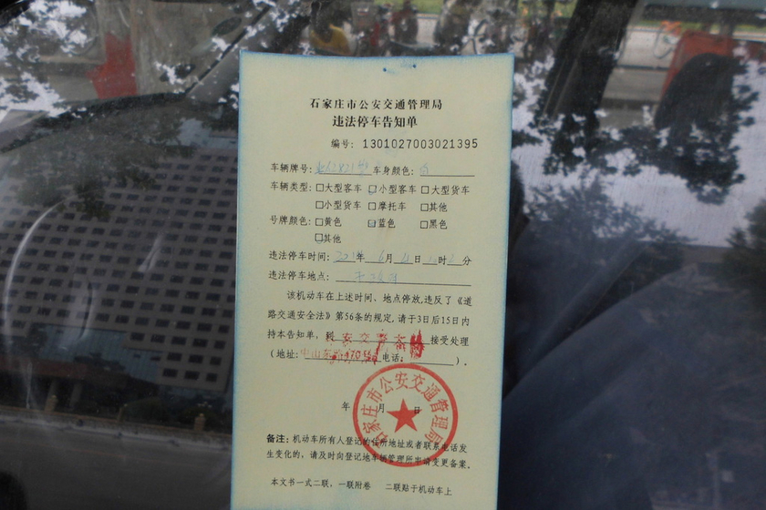 6月4日,河北石家庄市政府对面公园一侧的中山路行车道上,一辆110警务车辆违法违规停放在路边超过5个小时,被该路段执勤的交警贴上黄色违法罚款通知书。 东方IC