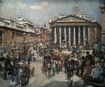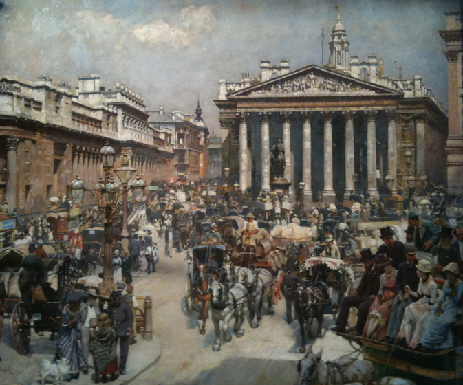 十九世纪中期一幅油画展现出伦敦城皇家交易所前的繁忙景象。左边可见当年的英格兰银行大楼,是一座只有两层的建筑。 李弘供图