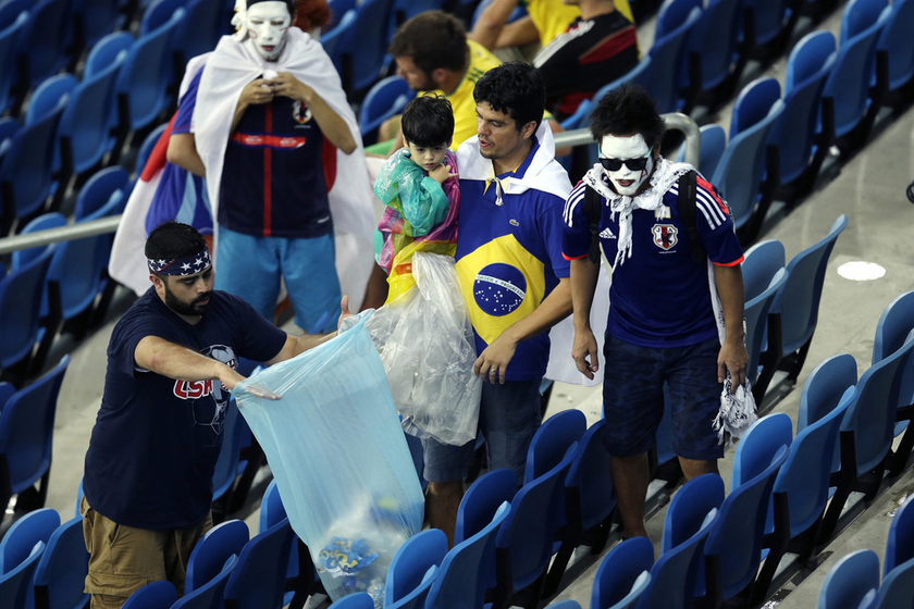 当地时间6月19日,巴西纳塔尔沙丘球场,2014巴西世界杯小组赛C组,日本与希腊比赛后,日本球迷在退场时收拾身边的垃圾。 东方IC