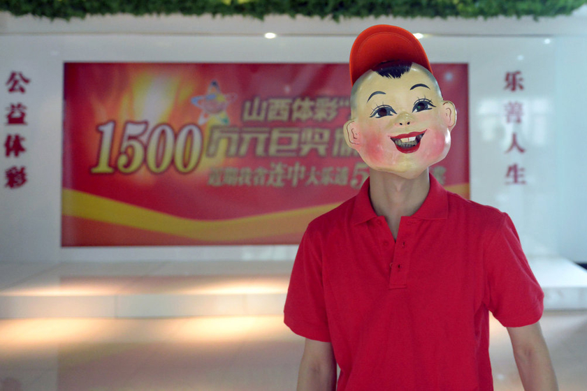 2014年7月7日,山西省太原市山西省体育彩票管理中心,一位男彩民头戴“萌娃”面具领取了体彩“大乐透”1500万元奖金。 刘江/CFP
