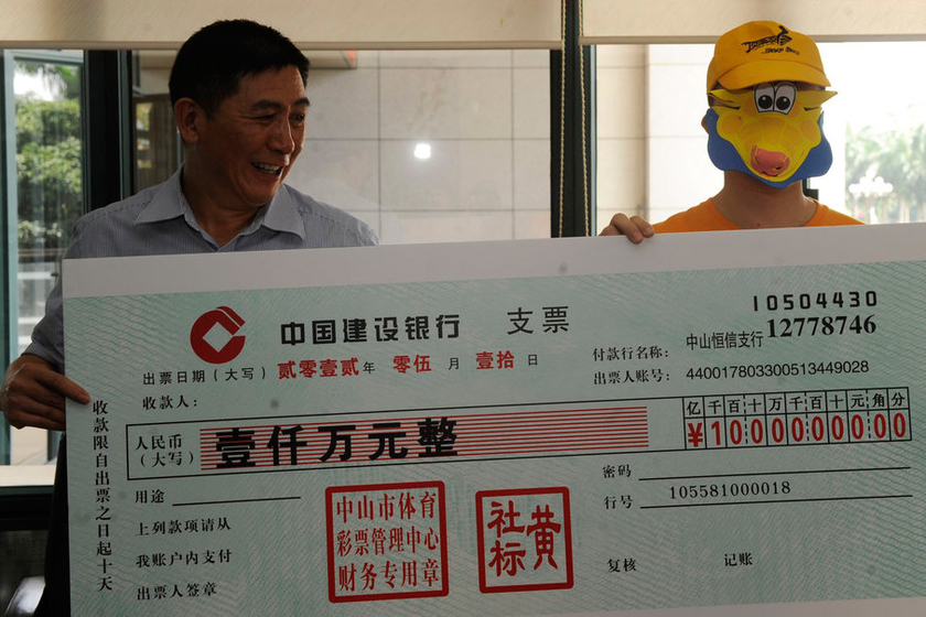 2012年5月10日,广东中山,中奖彩民头戴面具从中山体育彩票管理中心主任黄社标的手中接过1000万元的支票。 吴进/CFP