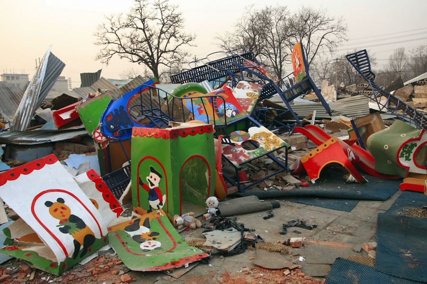 2010年12月17日凌晨,北京市丰台区看丹村多名联防队员闯进该村一个民工子弟幼儿园内,幼儿园负责人被强行带离,挖掘机、推土机随后驶入,幼儿园化为废墟。老徐一家苦心经营两年多的幼儿园已是废墟一片,破损的玩具和设施杂乱地压在废墟中。 詹敏/CFP