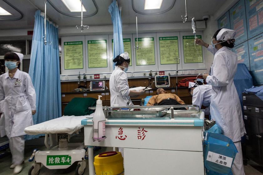 2014年5月12日,福建泉州,福建医科大学附属第二医院急诊室里,两名护士为一名被公交车撞上浑身是血的病人输液。 CFP