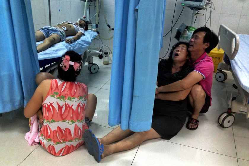 2013年8月24日,北京,医院急诊室内,被撞男童躺在床上奄奄一息。奶奶(穿黑衣者)和父亲哭倒在地。当日,男童在十字路口被一辆黑色凯迪拉克轿车撞飞,男童送医不久后死亡。 CFP