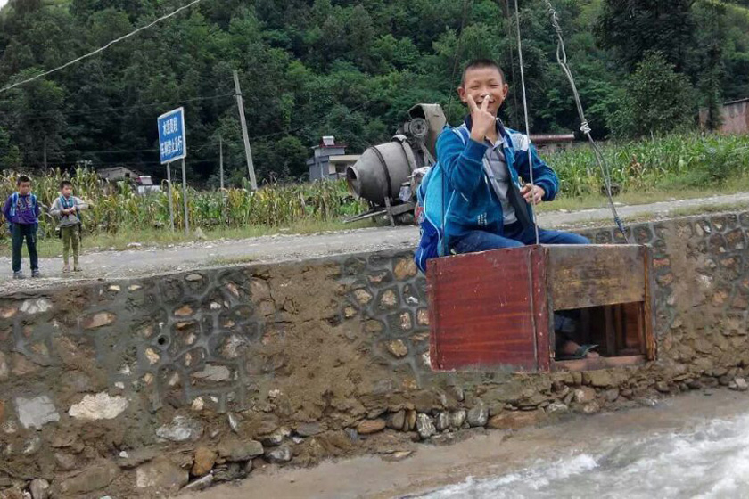 9月13日,陕西商洛山阳县板岩镇,村民通过简易缆车将孩子送过河。 田德政/CFP