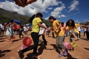 - 10月1日,云南省鲁甸县龙头山镇天气晴朗,灰街子安置点“儿童乐园”的数十名小朋友与志愿者一同做游戏,度过了一个快乐的国庆节。图为志愿者和小朋友一起做踩气球游戏。 CFP
