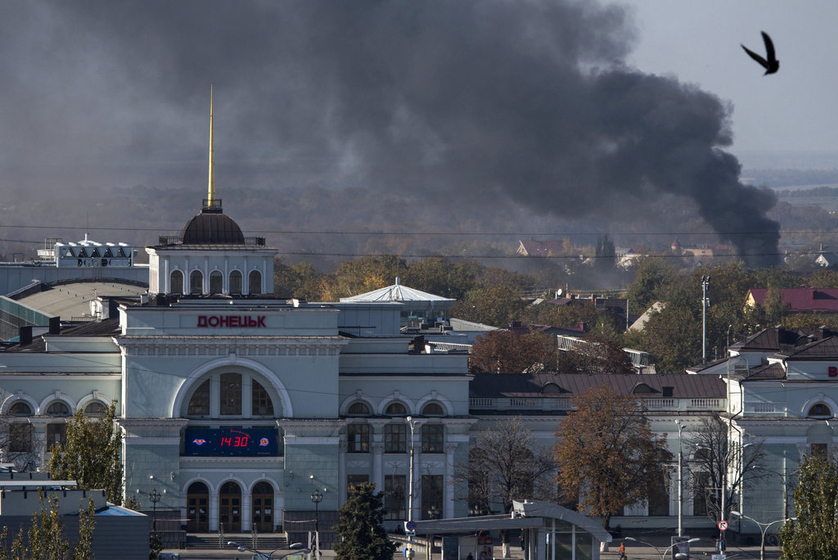 - 当地时间2014年10月12日,顿涅茨克,亲俄武装与乌克兰政府军交火进行炮击战,浓烟从火车站后升起。这里距离顿涅茨克普科菲夫国际机场距离不远。 Dmitry Lovetsky/东方IC