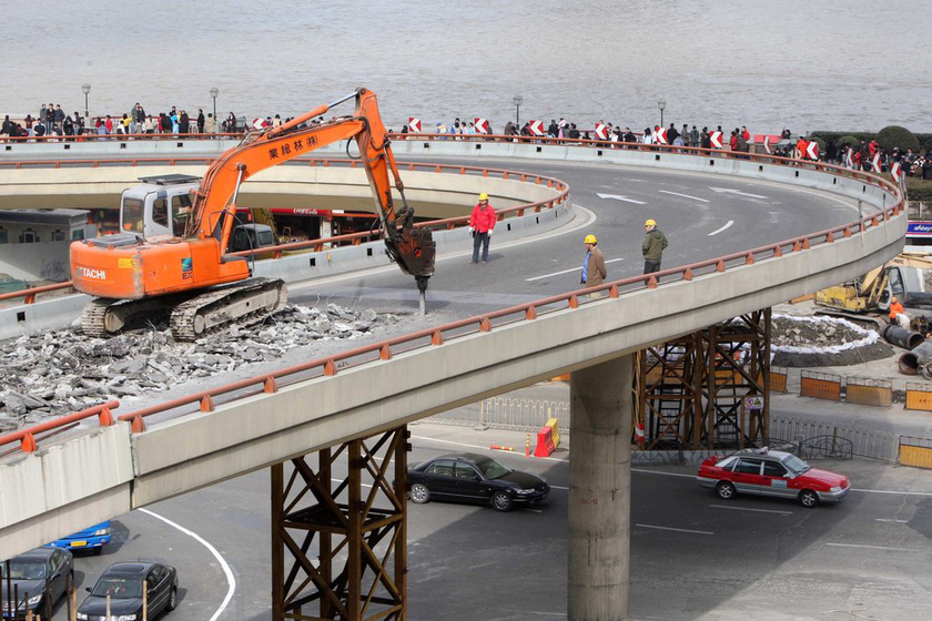 2008年2月23日上午,上海建工集团的镐头机在延安高架路东段上挖开路面。延安高架路东段俗称“亚洲第一湾”,因配合外滩通道综合改造工程被拆除。 早山/CFP