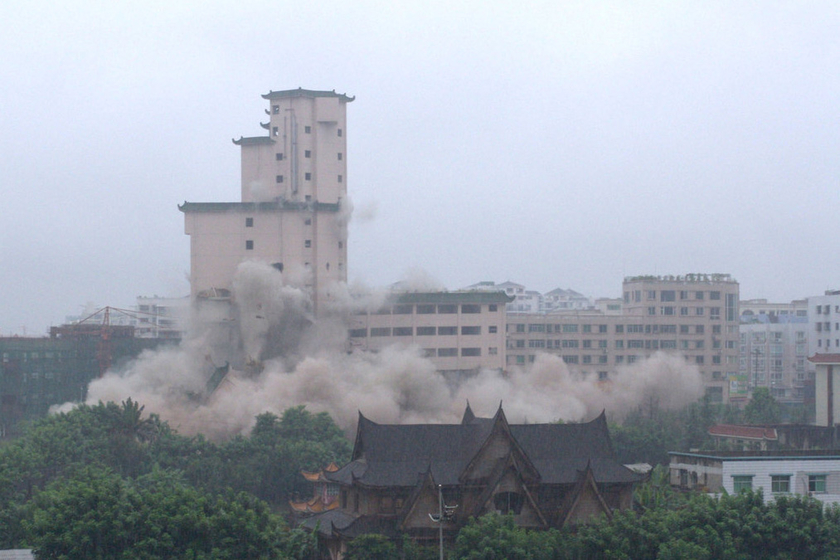 2005年8月20日上午,重庆永川市16层高的渝西会展中心在雨中定向爆破成功。渝西会展中心2000年建成使用,建设投资4000万元。因地理位置优越,拆除后拟建一座五星级酒店。 陈仕川/CFP