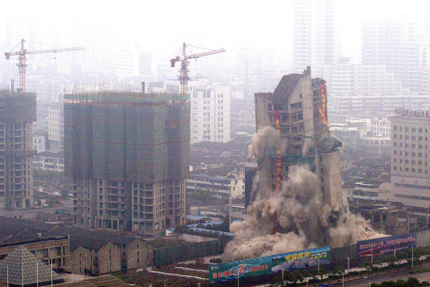 2004年5月18日,浙江温州中银大厦被爆破拆除。该楼投资6000多万元,1995年6月开工建设,1997年封顶时被发现质量问题。因其建成后长达6年无法投入使用成为温州市瞩目的“烂尾楼”。 赵刚/CFP