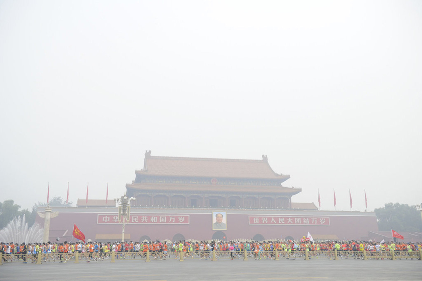 10月19日早上,2014年北京马拉松比赛开赛,PM2.5超过300,空气质量重度污染。18日下午,北京市政府正式发布空气重污染蓝色预警。18日晚,北京马拉松比赛组委会紧急发布温馨提示,请参赛选手根据自身情况选择参赛。 CFP