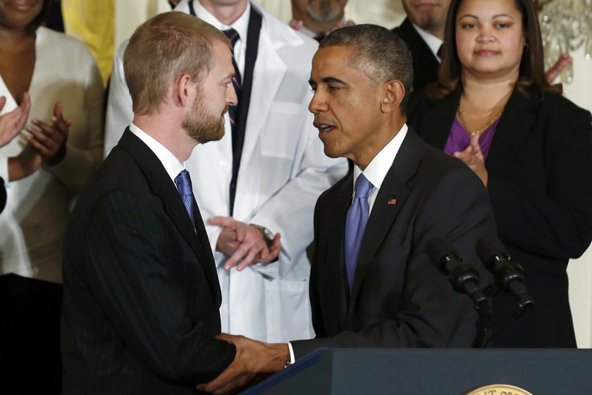 10月29日,美国华盛顿,美国总统奥巴马在白宫接见前往非洲做医疗义工染上埃博拉病毒后康复的校友肯特·布兰特里医生(Dr. Kent Brantly)并与其握手交谈。当天奥巴马发表针对防控埃博拉病毒的演讲。 CFP