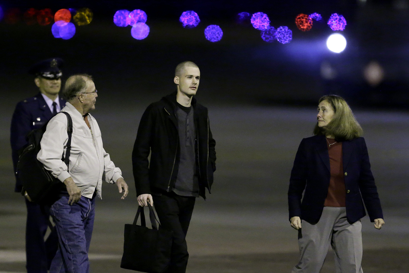 - 2014年11月8日,美国华盛顿州,被朝鲜释放的两名美国人裴俊浩和马修·米勒,抵达刘易斯-麦科德联合基地与家人团聚。图为马修·米勒(右二)。 Ted S Warren/东方IC
