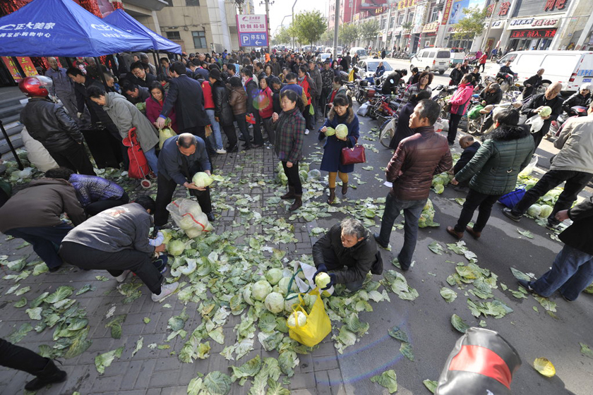 - 图为市民领取圆白菜,现场一片狼藉。 CFP