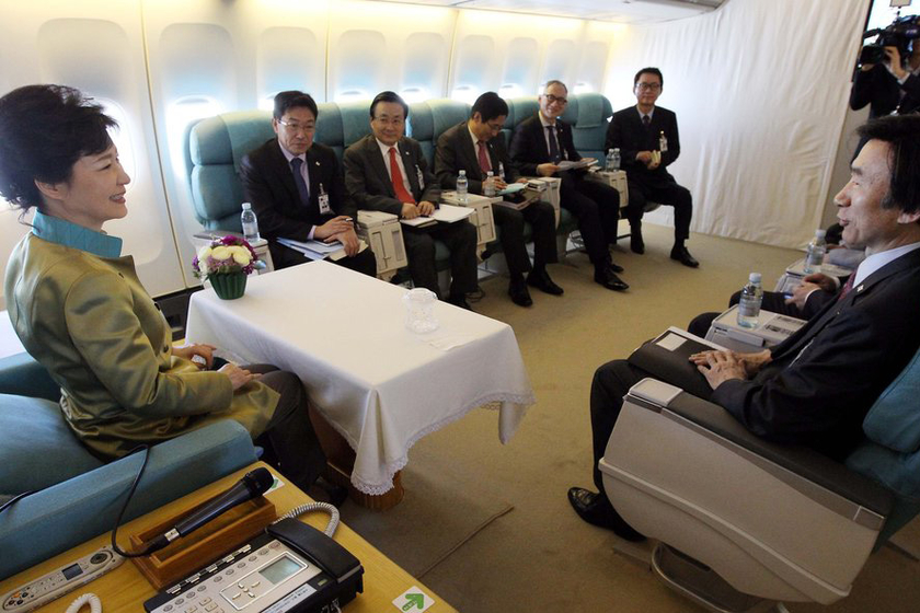 2013年5月5日,韩国总统朴槿惠(左)在飞往美国纽约的专机中与随行人员座谈。 CFP