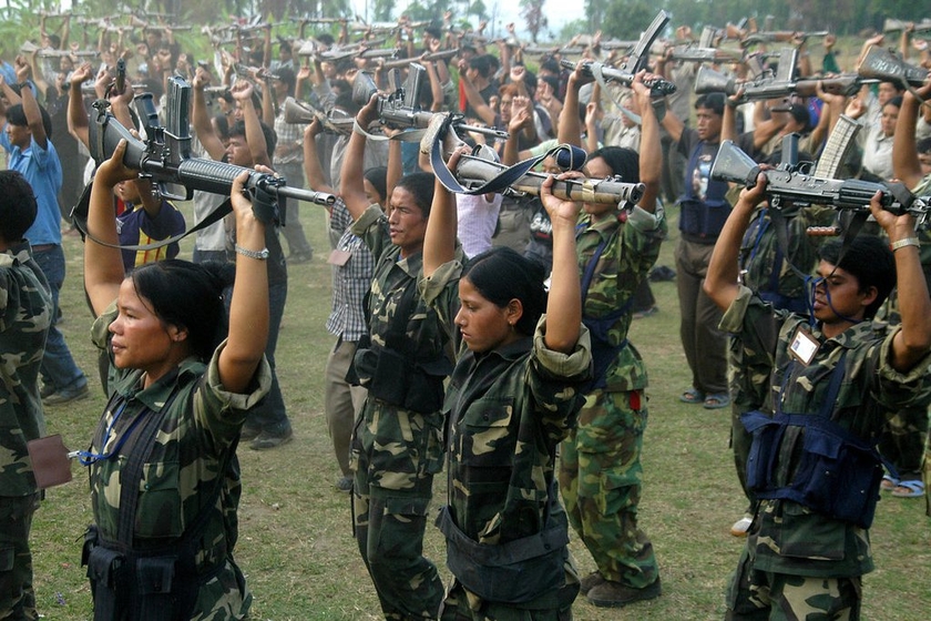 2006年11月10日,尼泊尔加德满都以南120公里的一处尼共(毛主义)武装据点里,一名年轻女孩和其他士兵一起训练。之前,尼共(毛主义)刚刚与政府达成停火协议。在第三世界的冲突中,女人和儿童扛枪上战场并不稀奇。 Polly Liu/CFP