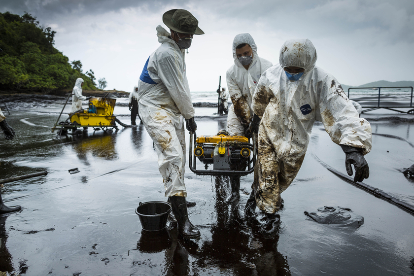 2013年7月27日,泰国海底输油管道破裂,泰国罗勇府附近20公里的海岸线受到污染,其中就包括泰国湾旅游胜地沙美岛。当地不得不关闭部分海滩,清理油污,旅游业受重创。 Jack Kurtz/东方IC