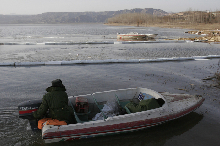 2009年12月29日,陕西华县中石油地下输油管道发生泄漏,漏油渗入河道,威胁黄河。图为2010年1月4日,三门峡黄河公路大桥下黄河水面上设置了一条拦油带。 张晓理/东方IC