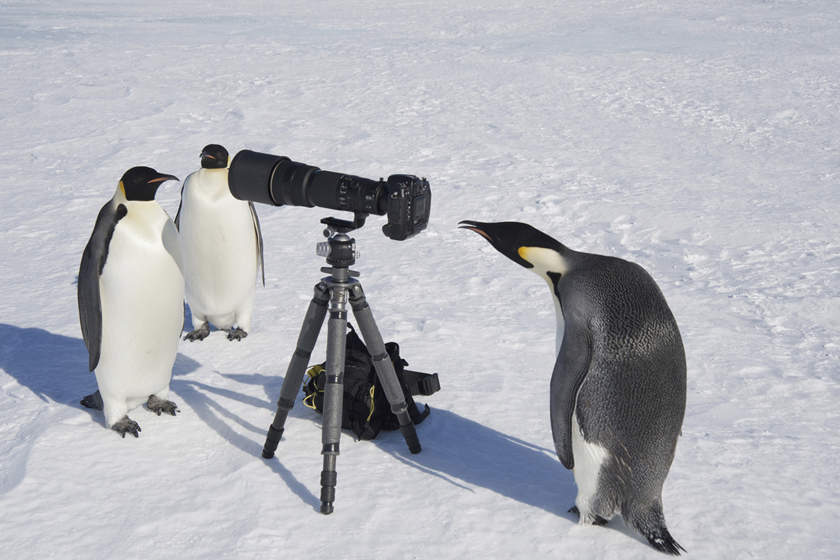 【瞧一瞧】2014年1月23日,斯诺希尔岛上几只帝企鹅好奇地看着摄像机和三脚架,其中一只眯着眼睛看取景器。