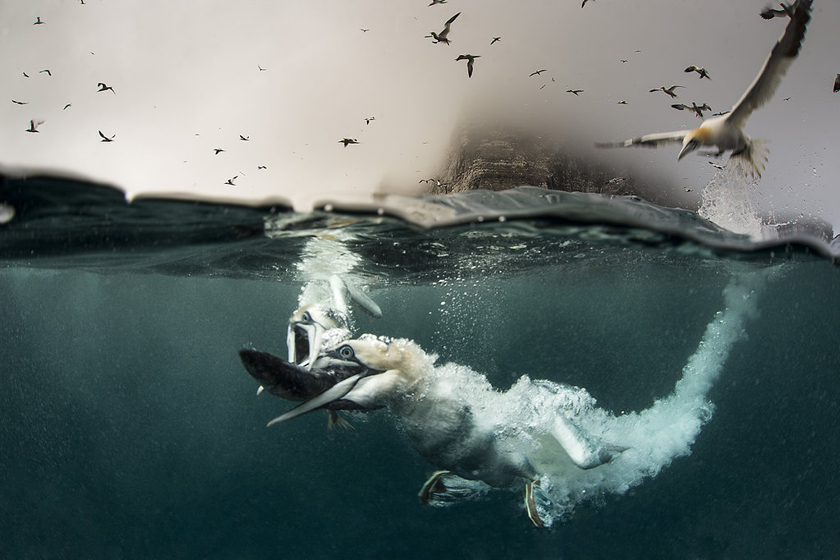 【比速度】2014年9月25日消息,英国设得兰群岛,成群塘鹅潜入水中捕鱼进食。