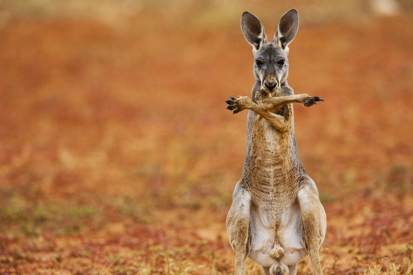 【做运动】2014年2月10日消息,澳大利亚新南威尔士州,这群生活在STURT STONY沙漠的红袋鼠常常发生争斗。雄性袋鼠为争夺主导地位和与雌性的交配权常常大打出手,通常在争斗之前,它们会像拳击手一样做些“热身运动”来舒展筋骨。