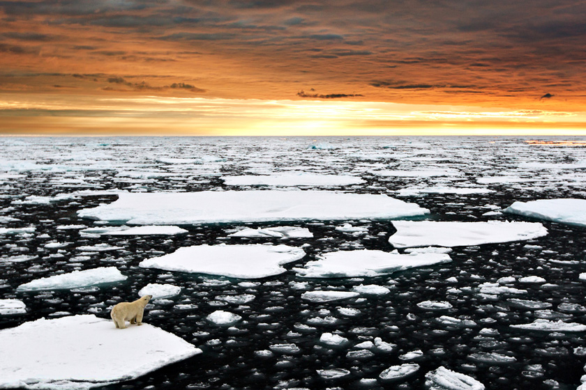【看夕阳】2014年2月16日消息,挪威斯瓦尔巴群岛,夕阳下,一只北极熊孤独地在浮冰间穿梭游走,场面显得既美丽壮观又凄怆悲凉。