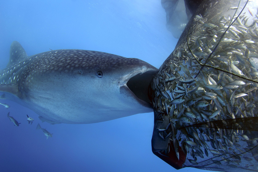 【抢美食】2014年5月29日消息,印尼极乐岛湾,一头厚脸皮的鲸鲨张开大嘴,想要吞下拴在一艘渔船上的一大网小鱼。