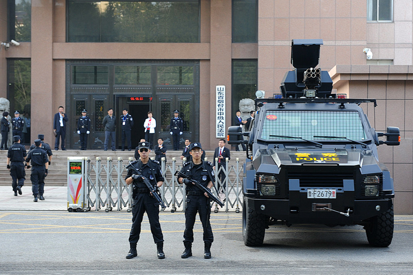 【招远“麦当劳杀人案”】2014年10月11日,山东招远涉邪教故意杀人案,在山东烟台中级人民法院第一审判庭公开宣判。张帆、张立冬被判死刑,吕迎春被判无期徒刑,张航、张巧联分别被判处有期徒刑十年和七年。图为法院门前安保严密,戒备森严,执勤特警荷枪实弹,数十家媒体人员在审判庭外等候。2014年5月28日,6名全能神教徒在山东招远一家麦当劳餐厅将一名无辜女性吴某殴打致死,引发全国震惊。andy/CFP